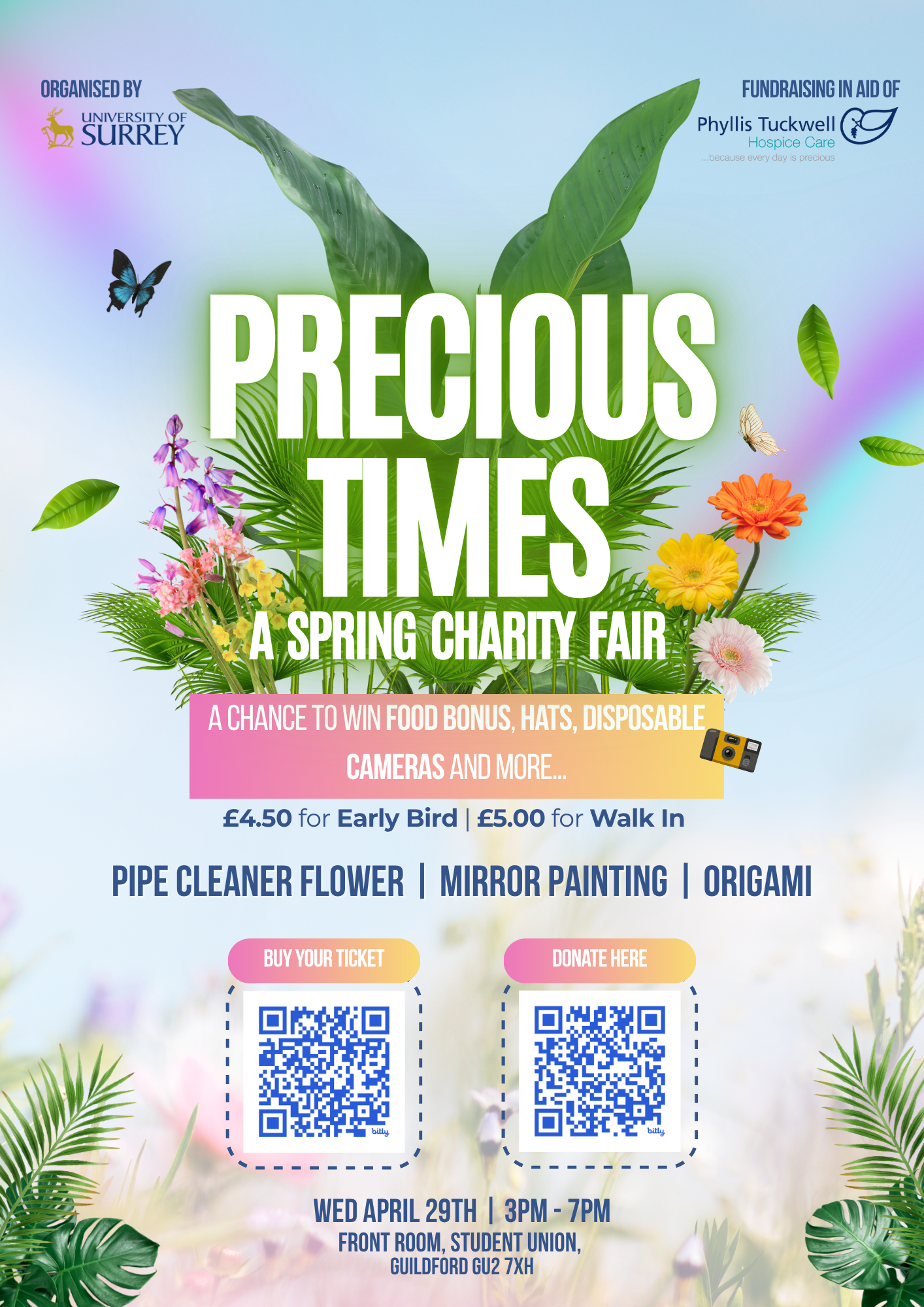 Join us for a heartwarming celebration of community and creativity at Precious Times: A Spring Charity Fair. Organised by International Event Management Master’s students, this event is a collaboration with Phyllis Tuckwell, an organization dedicated to providing specialist hospice care for adults and families across West Surrey and North East Hampshire.