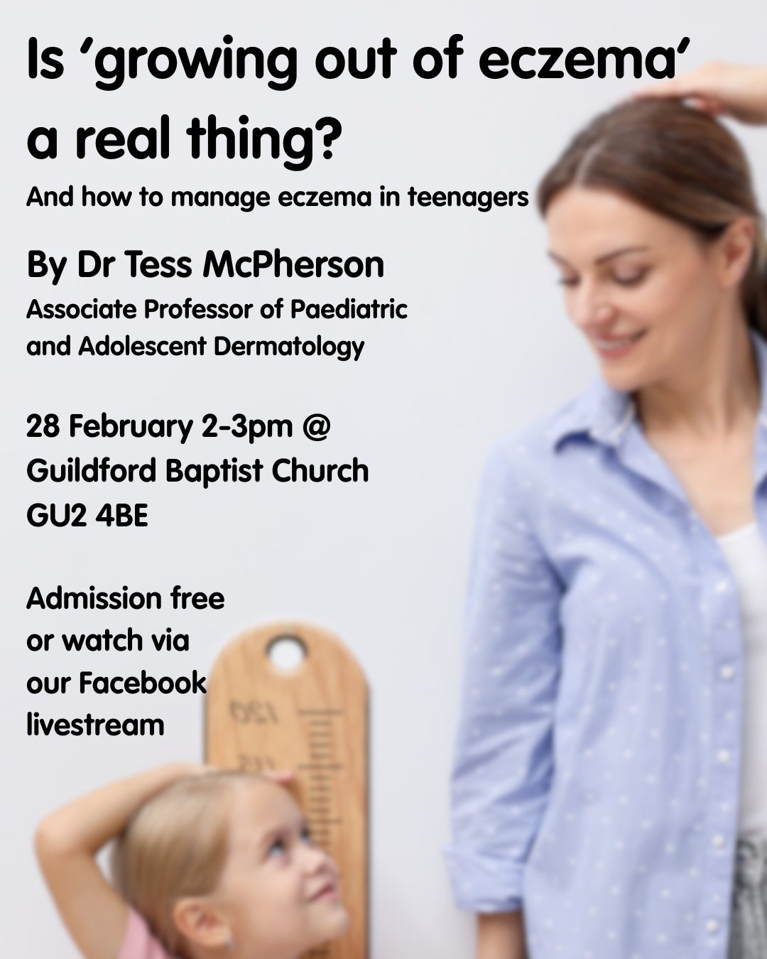 Join the West Surrey and North East Hants Support Group of the National Eczema Society for an Information Afternoon. Professor Tess McPherson, Associate Professor of Paediatric and Adolescent Dermatology University of Oxford. Consultant Dermatologist Oxford University Hospitals, will talk about why some children ‘grow out of eczema’ and others don’t with a focus on how to manage eczema in teens and beyond.