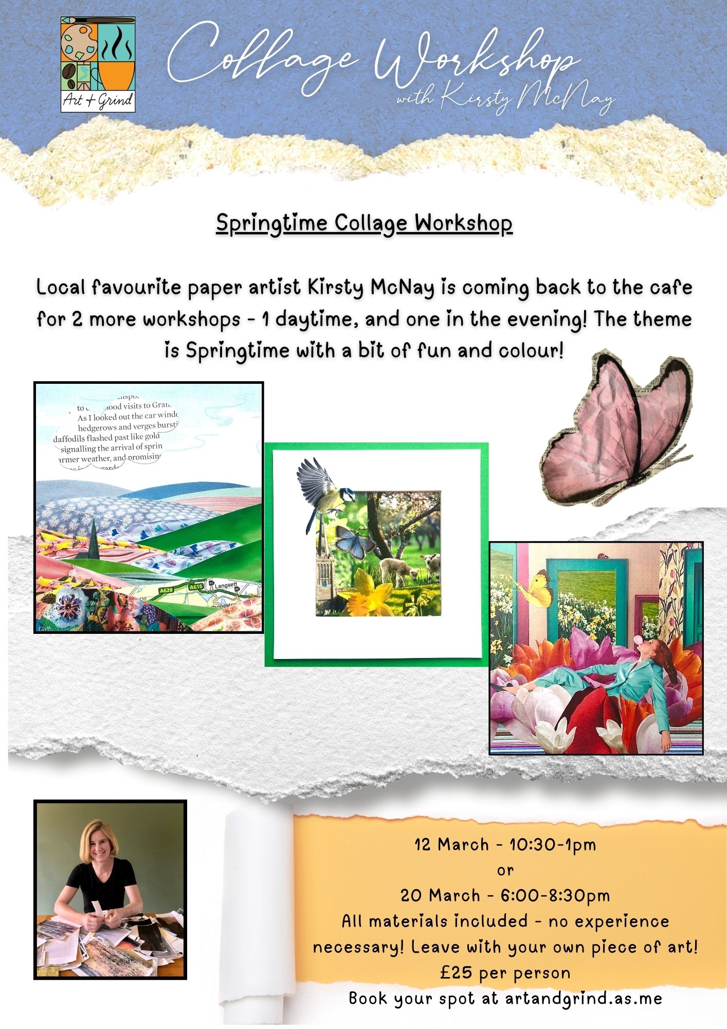 Come join local favourite Kirsty McNay in our cafe for a fun session as she guides you to choose colours and textures from paper and magazines to make your own frame-worthy piece of art! The theme is Springtime with all the colours, textures and images that evoke a bright and sunny day with maybe some fun twists! We have a daytime and an evening option for you to choose from.