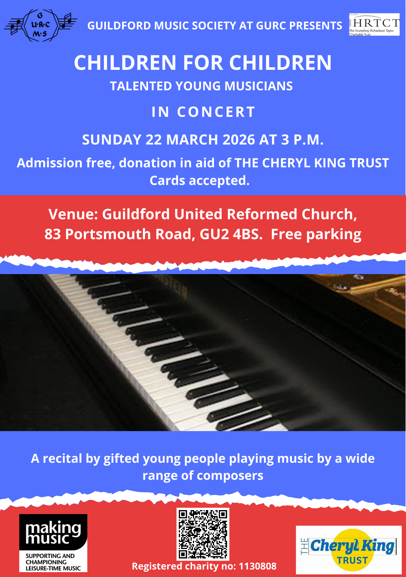 Talented local pupils will perform various pieces on a variety of instruments in order to raise funds for The Cheryl King Trust which believes that that no young person in Surrey should be prevented from learning a musical instrument because their parents can’t afford it. It achieves this by providing bursaries for instrument lessons and grants for music ensembles.