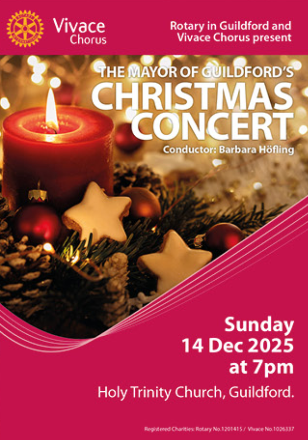 The Mayor of Guildford's Christmas Charity Concert is on Sunday, 14 December, 7pm, at Holy Trinity Church, Guildford. This popular carol concert will include a mixture of traditional and contemporary carols sung by Vivace Chorus along with your favourite audience participation carols.