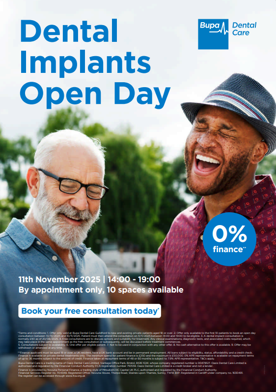 Considering dental implant treatment? Bupa Dental Care Guildford is offering a free consultation* at our Dental Implant Open Day on 11th November 2025. Our experienced clinician will be on hand to provide dedicated information about the treatment.